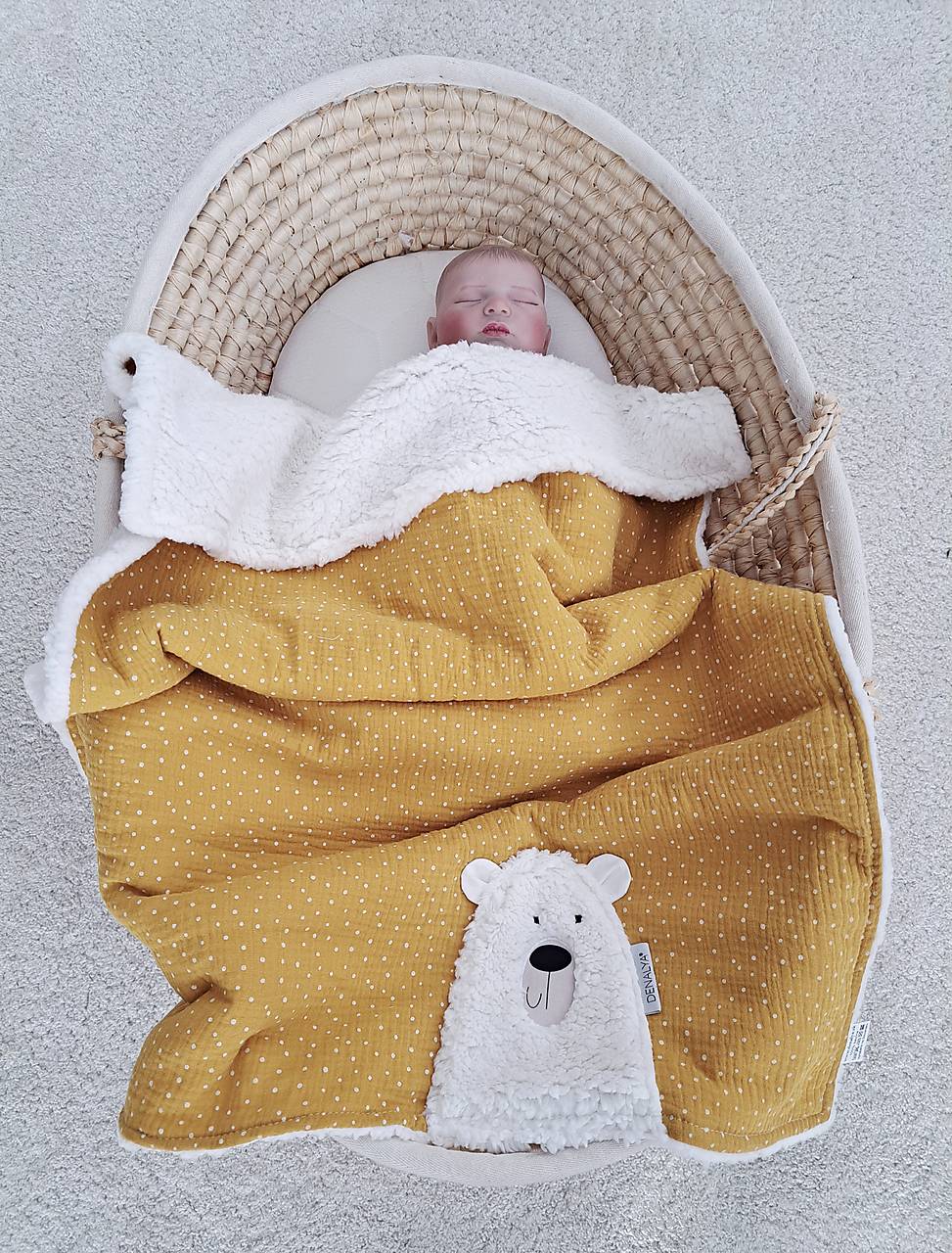 Úvod » Deky pre deti » Deka s barančekom » Mušelínová detská deka pre bábätko s barančekom a ľadovým mackom horčicová