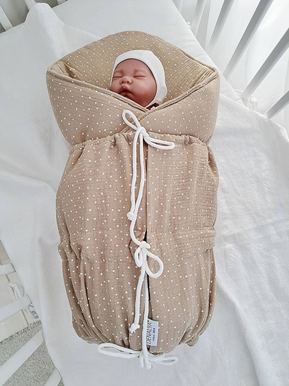 Úvod » Zavinovačky pre bábätká » Zavinovačka s viazaním » Mušelínové zavinovačky » Mušelínová šnurovacia zavinovačka bodky na kakaovej