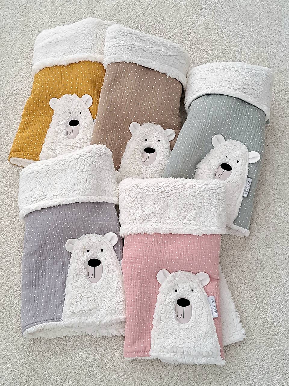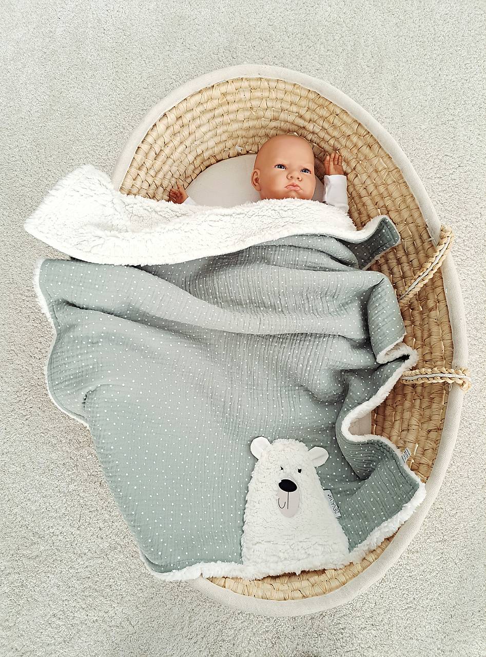 2.Mušelínová deka s príjemným barančekom vo farbe off white,dozdobená nami ručne robenou aplikáciou ľadového medvedíka.Deka má rozmer 65x90cm a u nás je nazývaná aj ako " tuľkacia deka