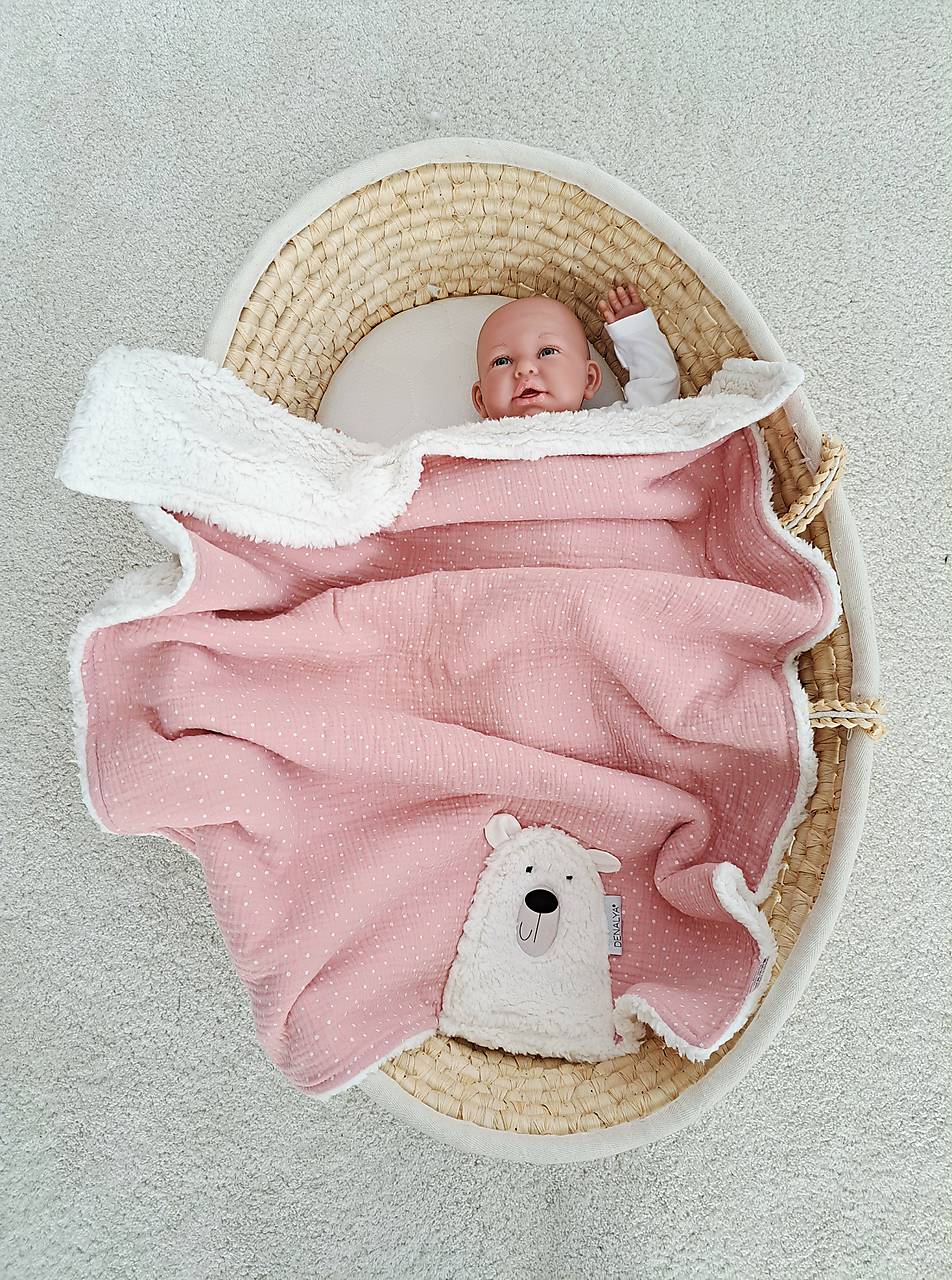 2.Mušelínová deka s príjemným barančekom vo farbe off white,dozdobená nami ručne robenou aplikáciou ľadového medvedíka.Deka má rozmer 65x90cm a u nás je nazývaná aj ako " tuľkacia deka
