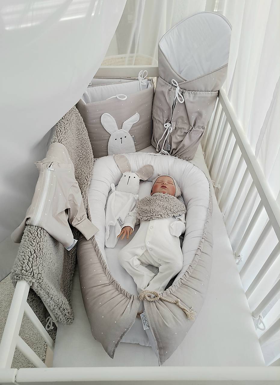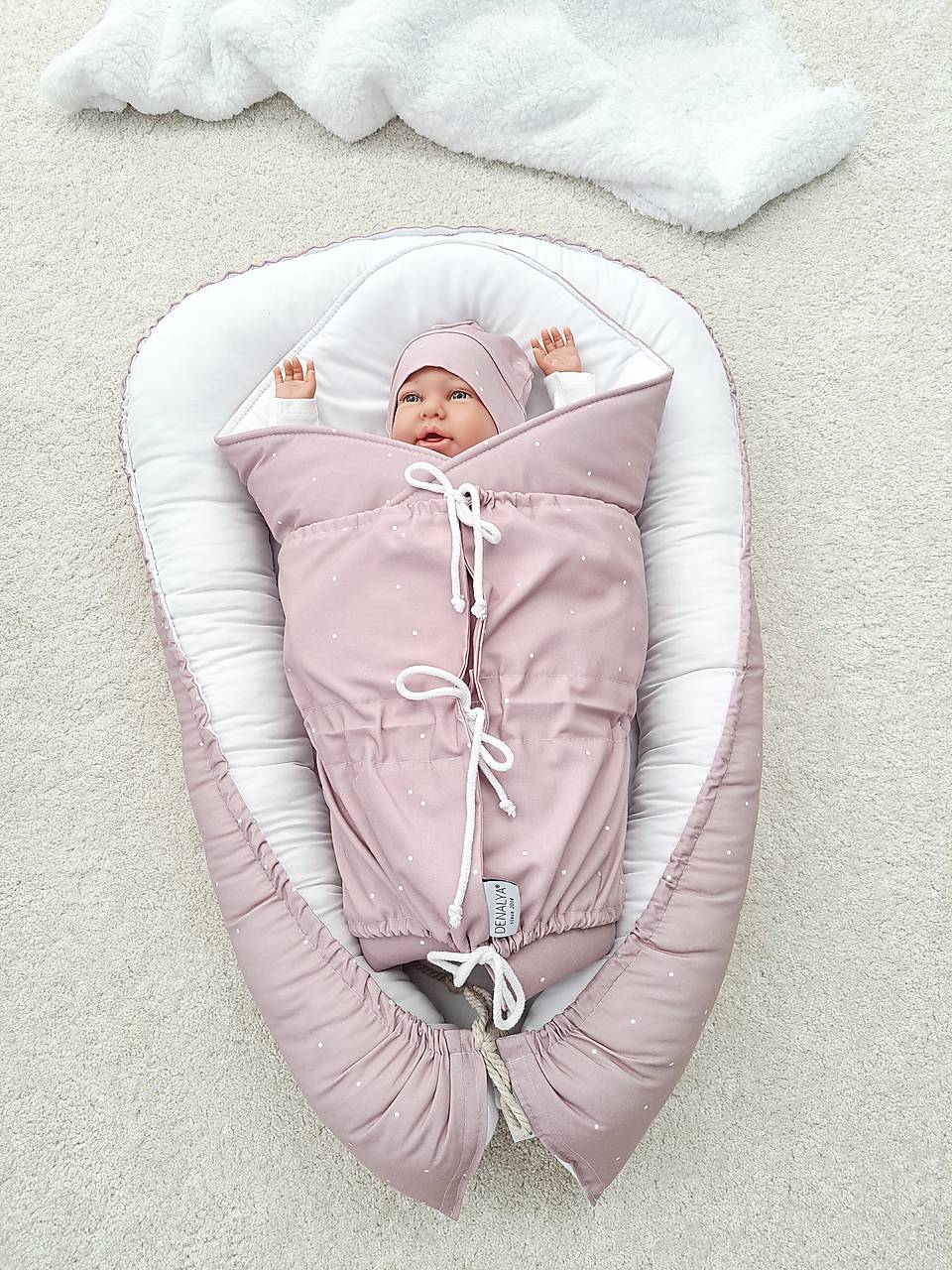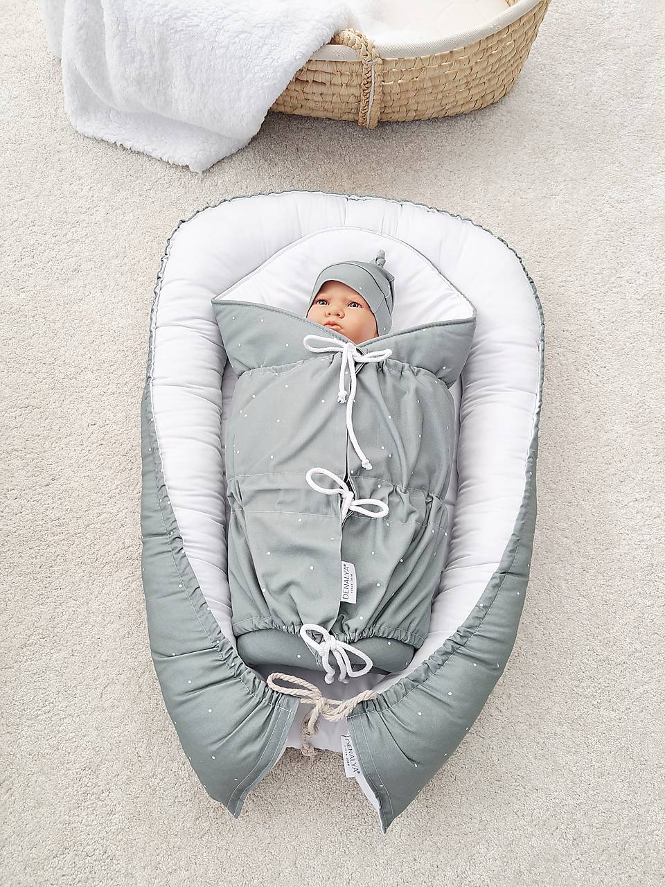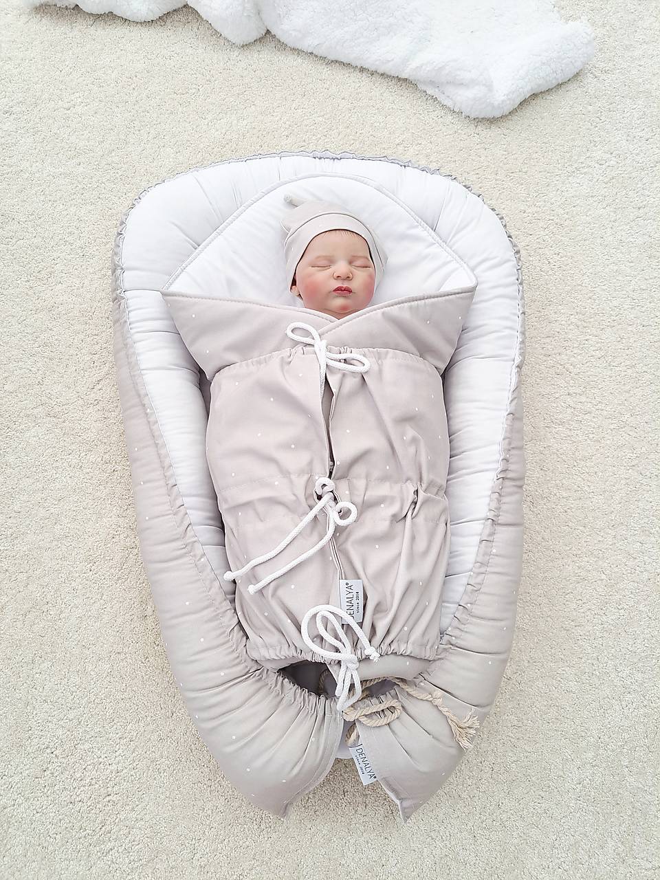 Úvod » Zavinovačky pre bábätká » Zavinovačka s viazaním » Bavlnené zavinovačky » Zavinovačka pre bábätko s viazaním biele bodky na pieskovo šedej