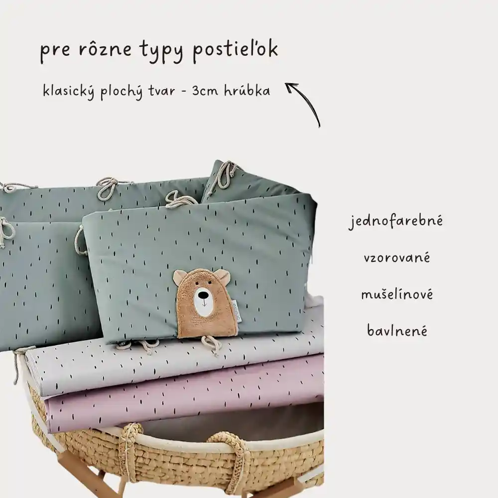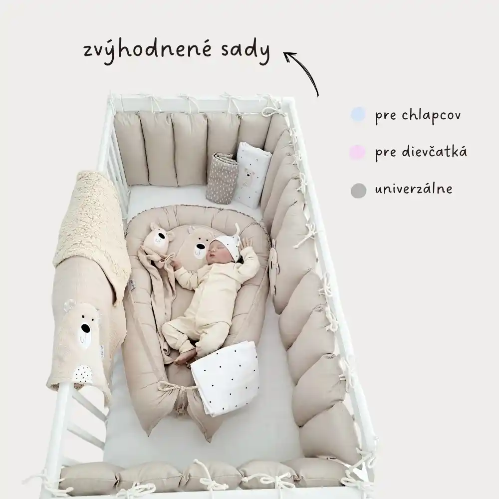 Jemná sada do detskej postieľky v odtieni Béžová Latte, vyrobená z kvalitnej bavlny a mušelínu. Vytvorená pre pohodlie, mäkkosť a bezpečný spánok vášho bábätka.