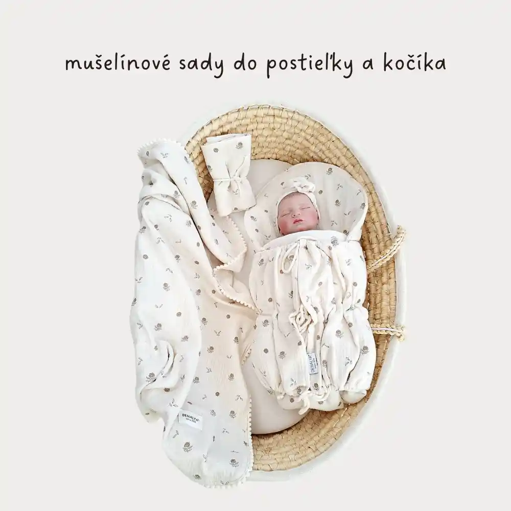 Letná, vzdušná a jemná mušelínová súprava do postieľky v krásnej mint farbe. Ideálna na teplé dni aj dovolenky – mäkká, priedušná a dokonale pohodlná pre bábätko.