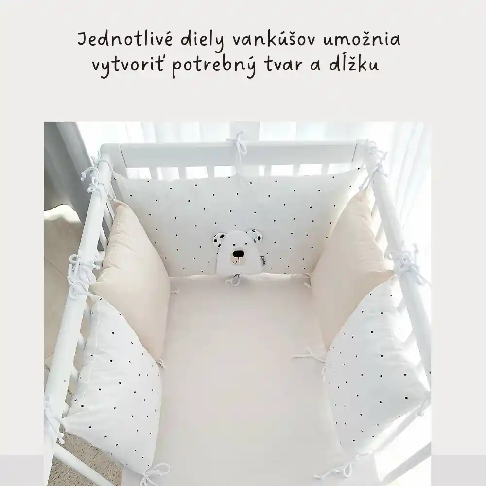 Jemná sada do detskej postieľky v kombinácii Latte a Bodky. Hniezdo, zavinovačka, mäkká deka, mantinel a doplnky vytvárajú harmonický a bezpečný priestor pre bábätko.